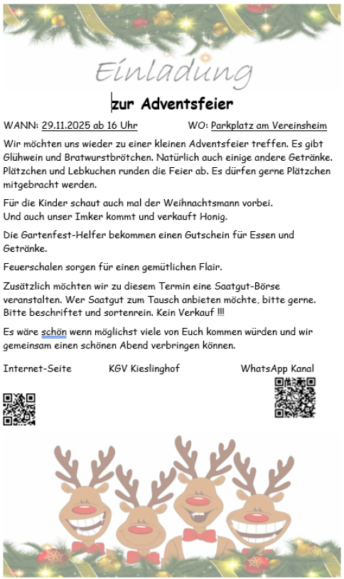 Unser Adventsfest steigt dieses Jahr am 29.11.2025. Hier wird es noch einen Aushang mit allen nötigen Informationen geben.