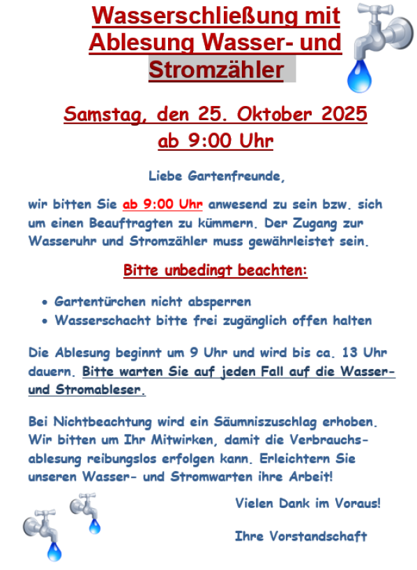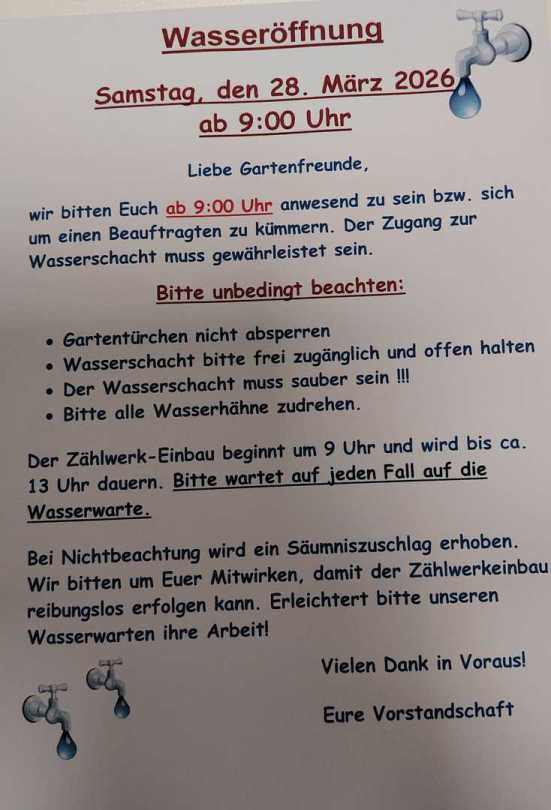Am 29.03.2025 ist unsere Wasseröffnung. Bitte wartet in euren Gärten, bis die Wasserwarte ihre Arbeit erledigt haben.
