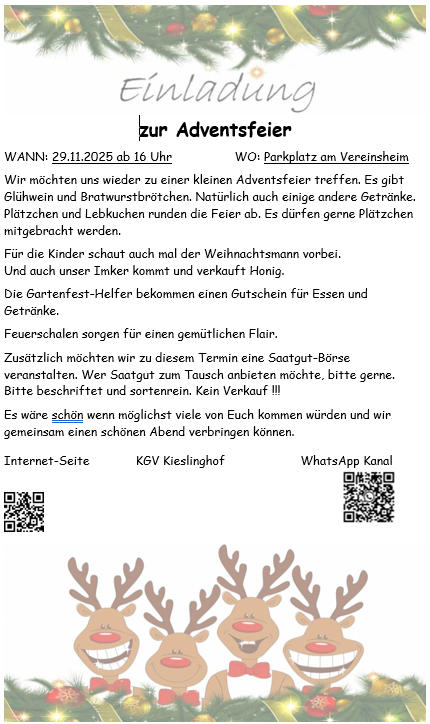 Möge 2025 euch Gesundheit, Glück und viele schöne Momente bringen, sowohl im Garten als auch im Kreis der Familie und Freunde. Wir freuen uns auf ein weiteres gemeinsames Jahr in unserem Verein und auf viele neue Begegnungen und Aktivitäten.